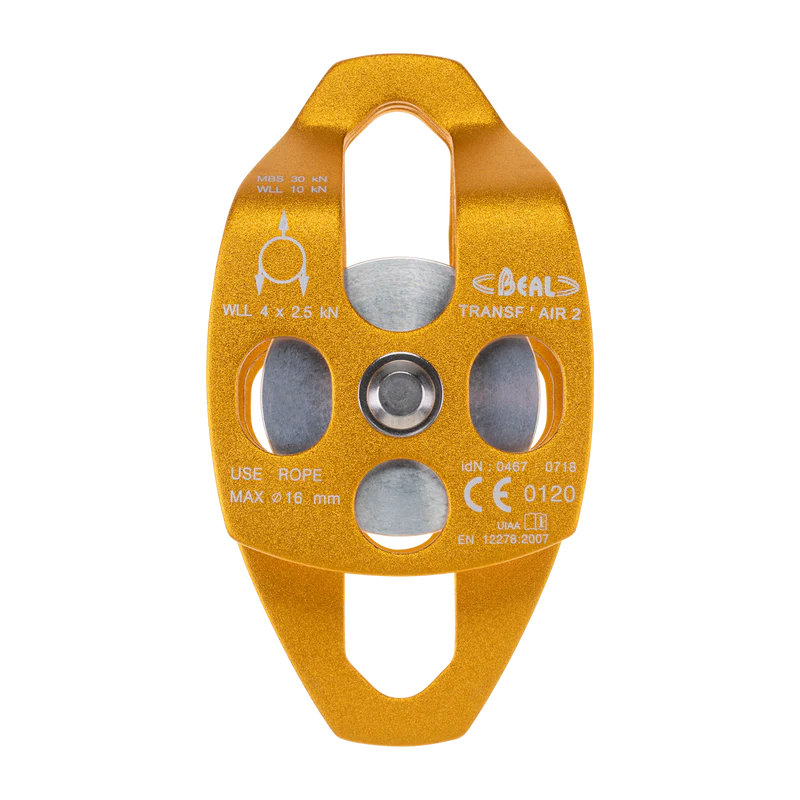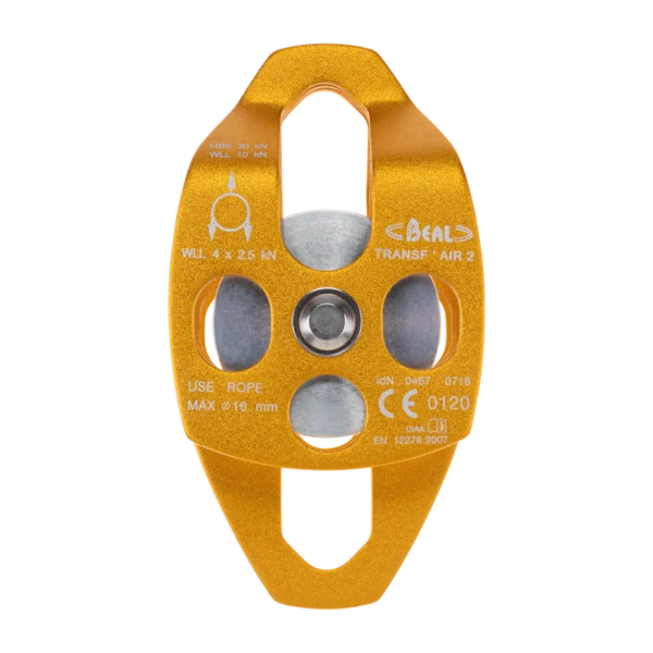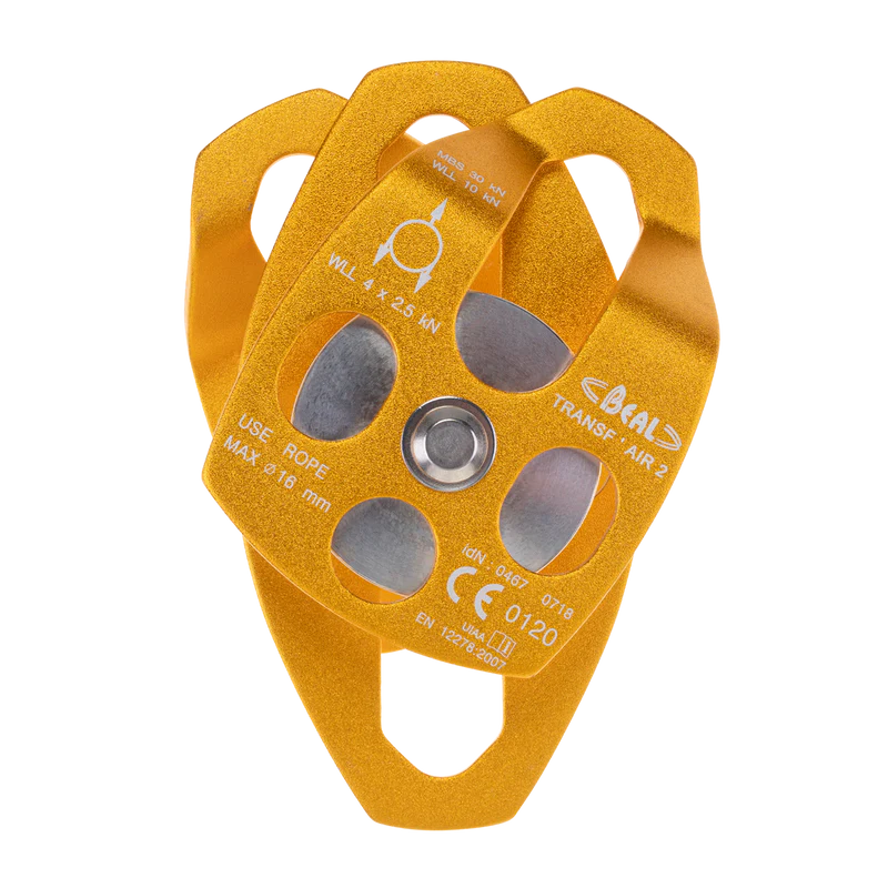 Beal dupla koturača Transf air 2 za dizanje tereta 1:3 ili 1:6 pozicije za kačenje karabinera na gornjoj i donjoj strani koturače. Za vece diametre užeta do 16 mm , maximalna nosivost do 3 t  maximalna  radna do 1 t.   Namenjena za dizanje tereta , spašavanje .